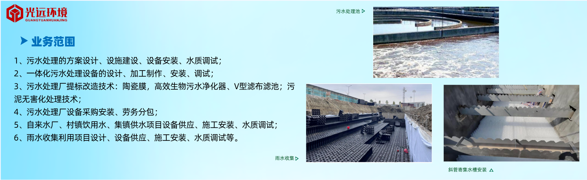 公司致力于污水處理事業的研究發展,主要從事:污水處理場、自來水廠、污水處理站、村鎮飲用水、集鎮供水等項目的設計、新建、提標改造和運行維護及相關工作。